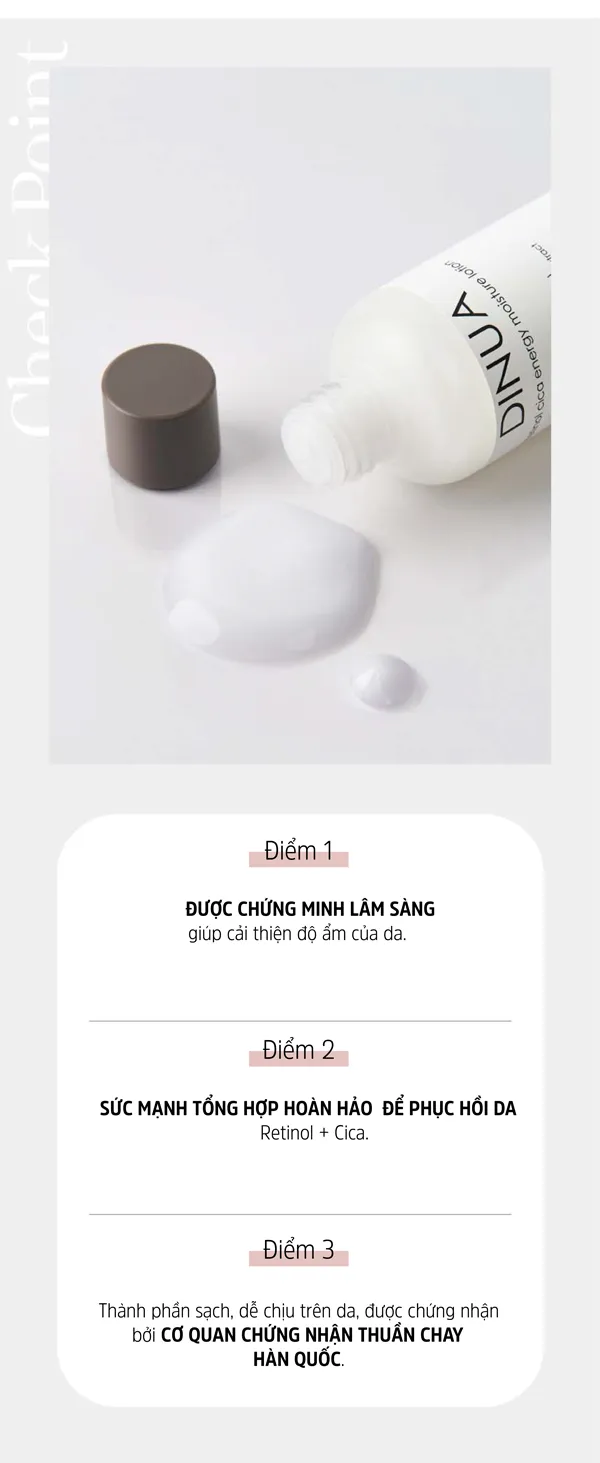 Dinua Retinol Cica Energy Moisture Lotion cân bằng dầu và dưỡng ẩm cho làn da ẩm mượt ngay từ lần sử dụng đầu tiên.