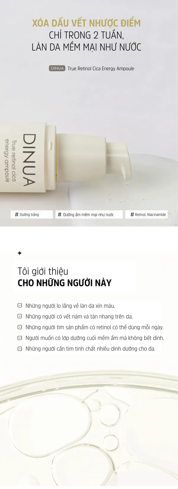Dinua True Retinol Cica Energy Ampoule xóa dấu vết nhược điểm chỉ trong 2 tuần cho bạn làn da mềm mại như nước.