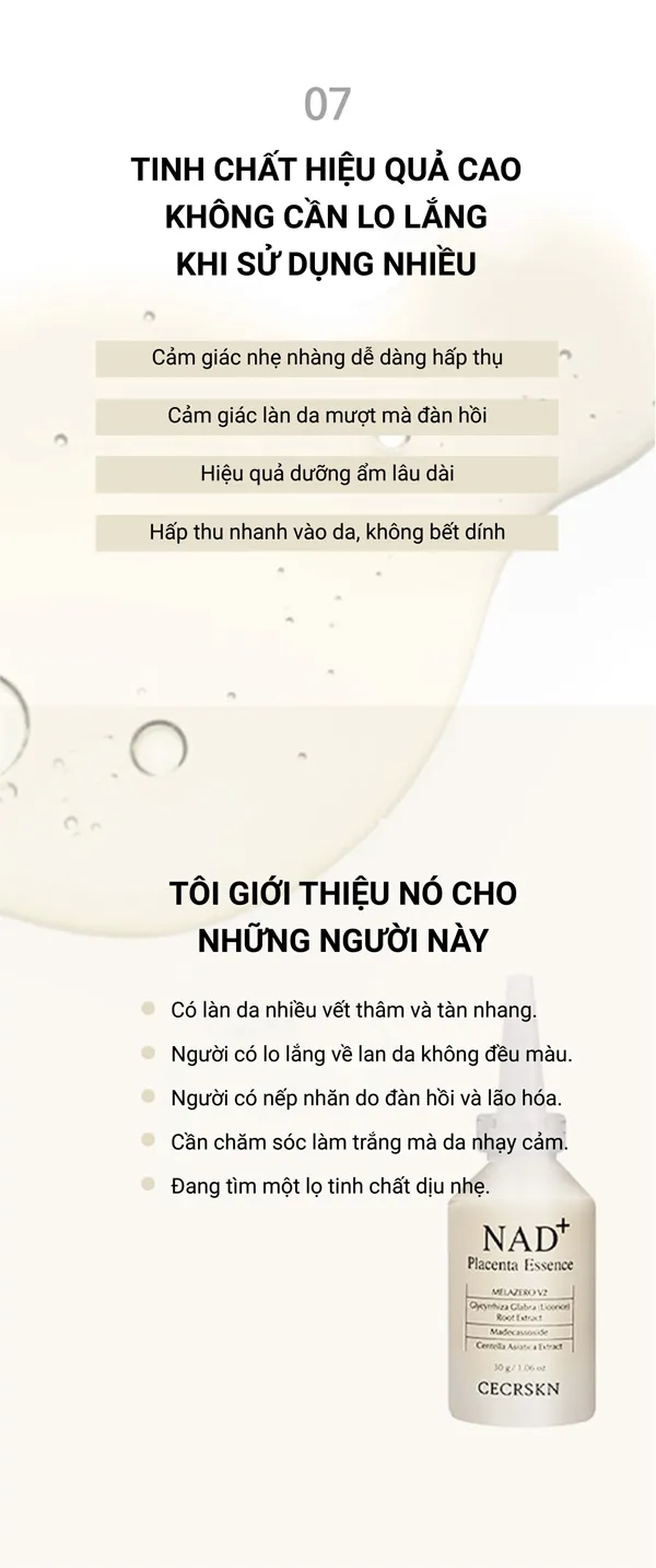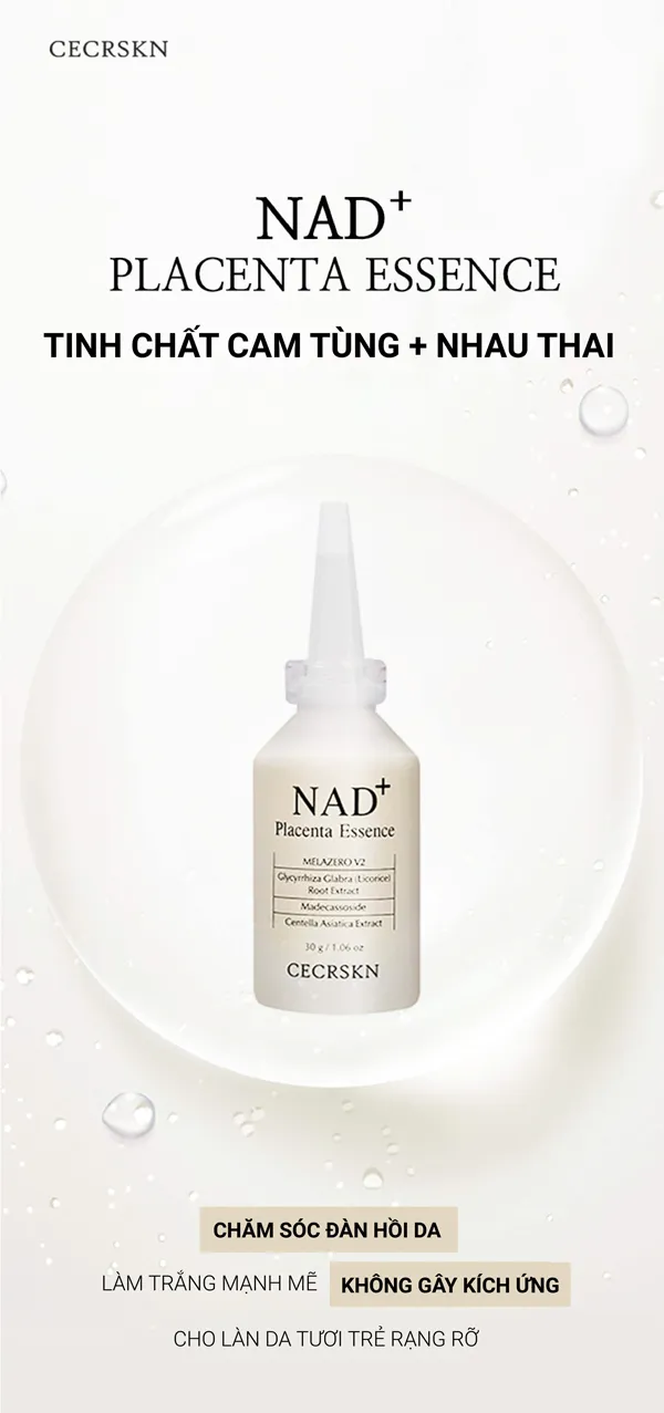 Tinh chất chiết xuất cam tùng + nhau thai NAD+ Placenta essence chăm sóc đàn hồi da. Giúp da trắng sáng mạnh mẽ mà không gây kích ứng da. Sự kết hợp tối ưu từ các nguyên liệu mang lại hiệu quả dưỡng trắng bật tông nhanh chóng cho làn da.