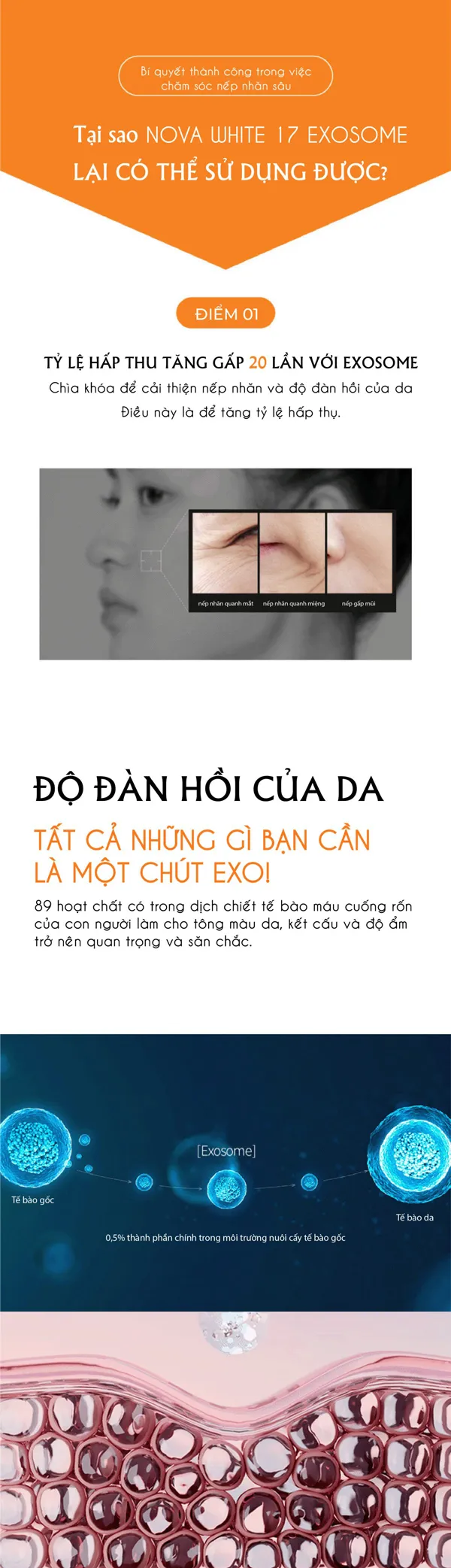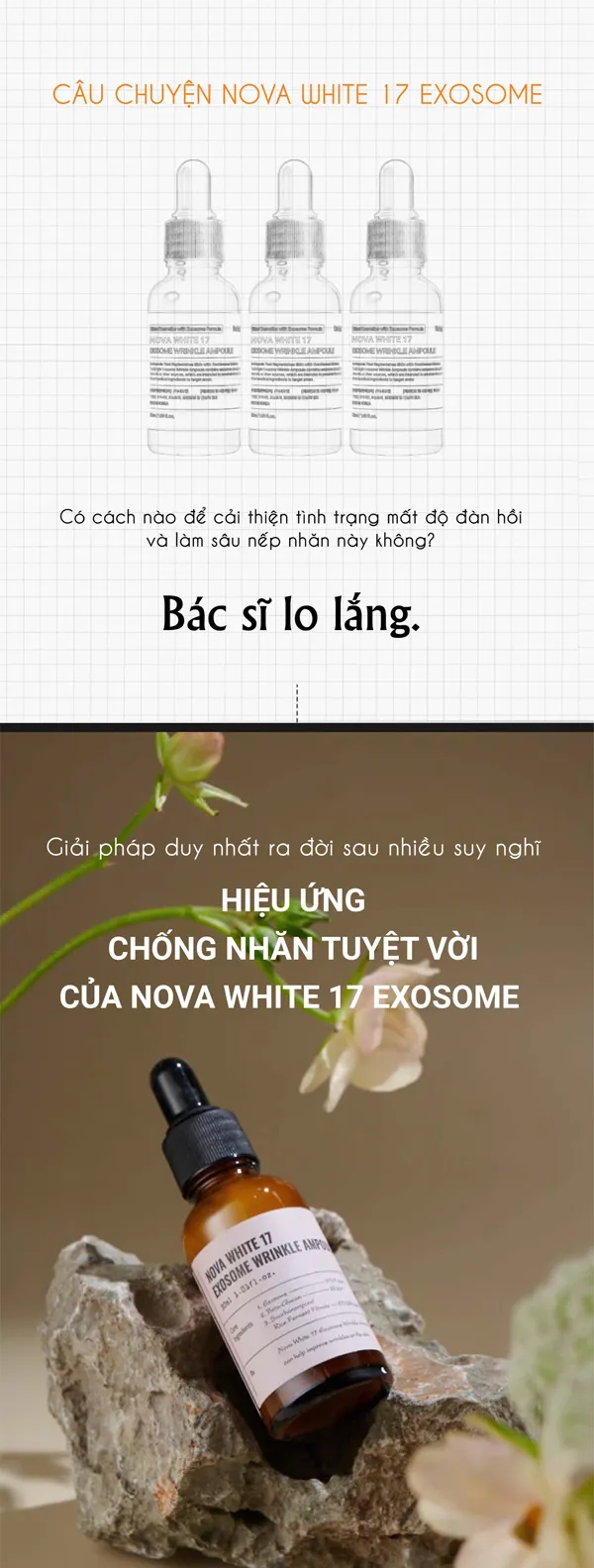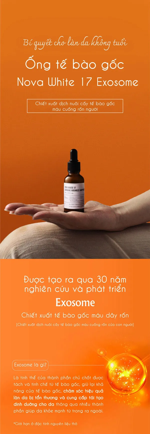 Nova White 17 Exosome Wrinkle Ampoule được tạo ra qua 30 năm nghiên cứu và phát triển Exsome với chiết xuất dịch nuôi tế bào gốc máu cuống rốn của con người cho bạn một làn da không tuổi. Với hàm lượng axosome 97.95% chăm sóc tế bào bị tổn thương và tái tạo dinh dưỡng cho da thông qua nhiều thành phần giúp da khỏe mạnh từ trong ra.