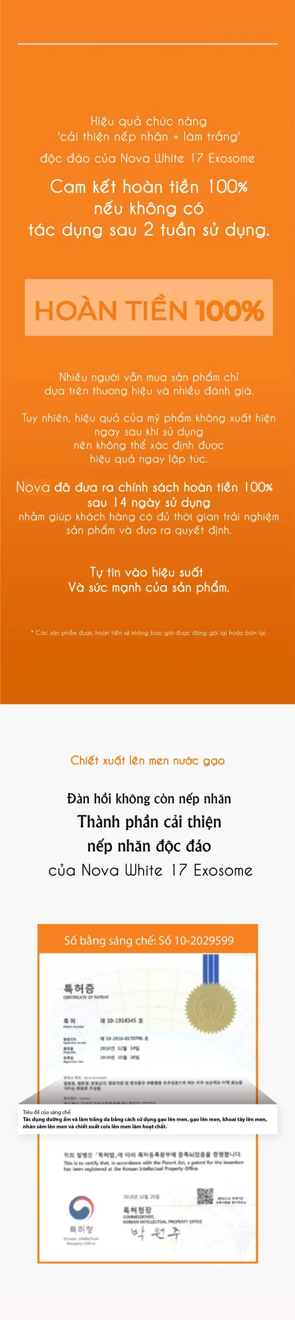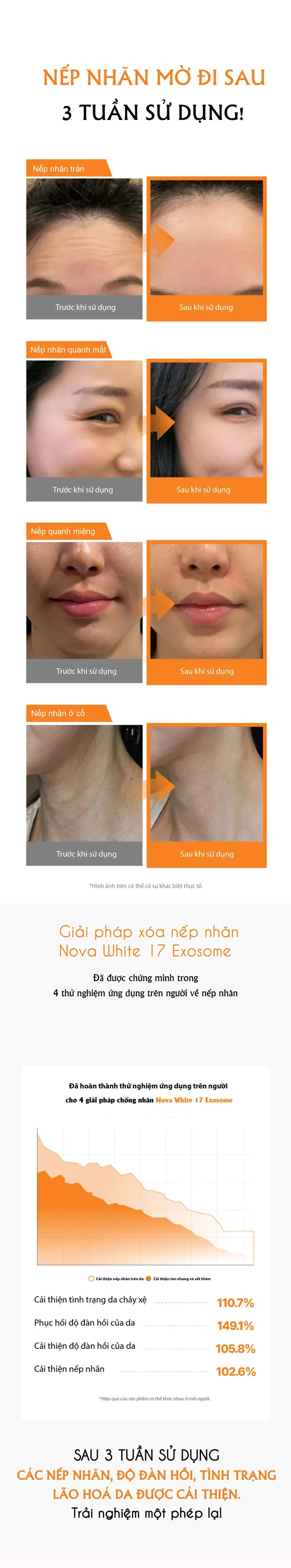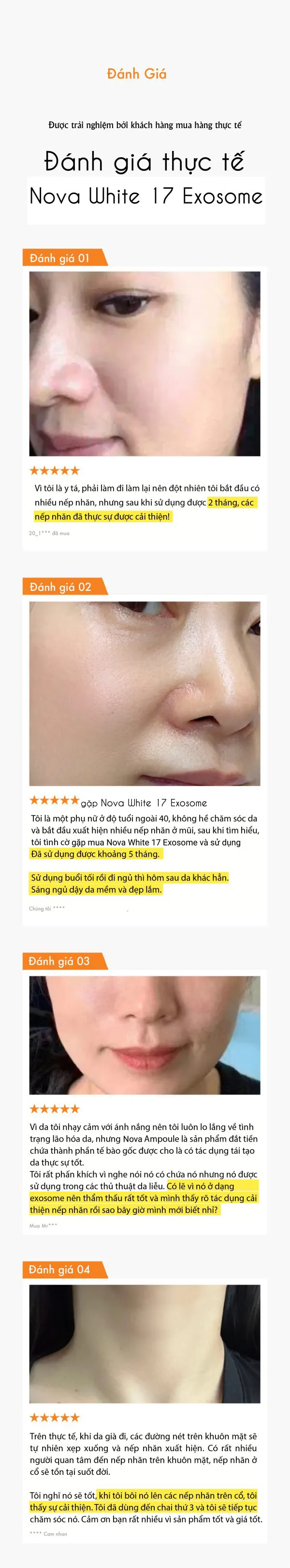 Nova White 17 Exosome Wrinkle Ampoule được tạo ra qua 30 năm nghiên cứu và phát triển Exsome với chiết xuất dịch nuôi tế bào gốc máu cuống rốn của con người cho bạn một làn da không tuổi. Với hàm lượng axosome 97.95% chăm sóc tế bào bị tổn thương và tái tạo dinh dưỡng cho da thông qua nhiều thành phần giúp da khỏe mạnh từ trong ra.