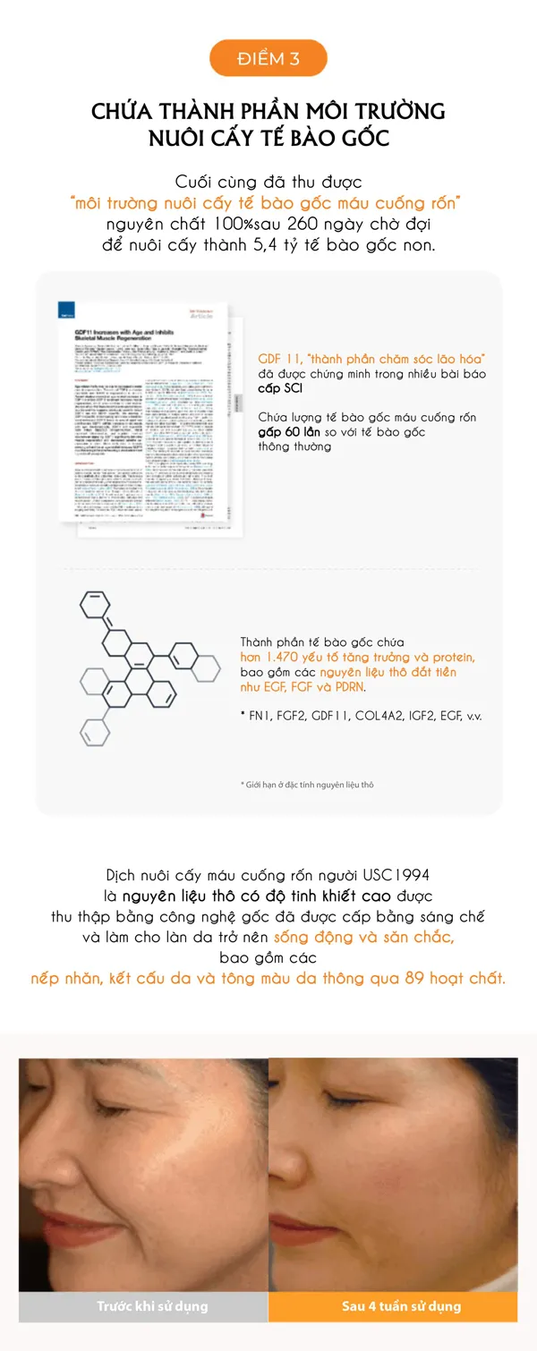 - H àm lượng axosome 97.95%,EGF, FGF, PDRN, Collagen trọng lượng phân tử thấp, Coenztym Q10, Axit Hyaluaronic gấp 9 lần