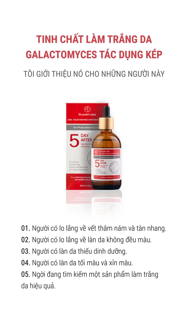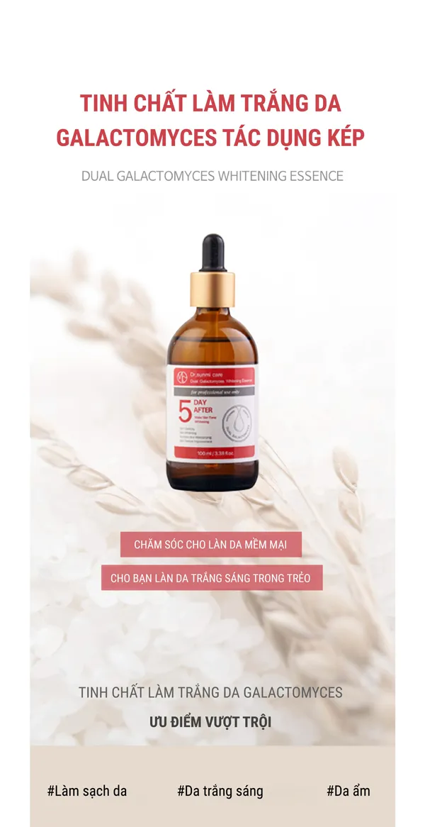 Tinh Chất Làm Trắng Da Dual Galactomyces Whitening Esscence chăm sóc cho làn da mềm mại, cho bạn llanf da trắng sáng trong trẻo với các ưu điểm vượt trội : Làm sạch da, giúp da trắng sáng, dưỡng ẩm da chỉ với 5 ngày để thấy hiệu quả rõ rệt với những kiểm nghiemj lâm sàng đã được kiểm chứng.